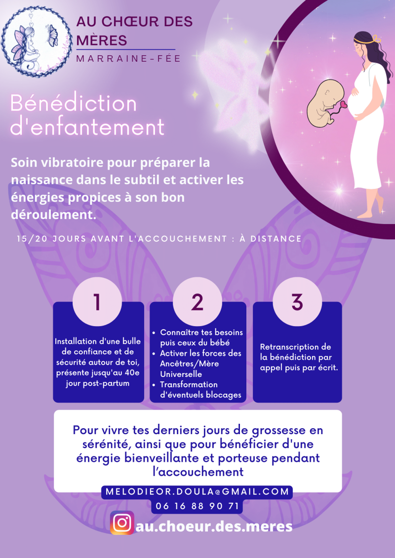 - Le soin vibratoire: environ 2 à 3 semaines avant le terme (à la date choisie), tu vas t’installer confortablement chez toi dans une ambiance douce, en sécurité et pleinement Présente pour recevoir le soin vibratoire de bénédiction à distance. Durant 40 min, reste simplement à l’écoute de ton corps et en lien avec ton bébé, afin que votre petite équipe puisse se synchroniser. Il est possible que d'anciennes mémoires émergent, que certaines émotions te traversent, que tu reçoives les messages toi-même ou que ton être se repose simplement.